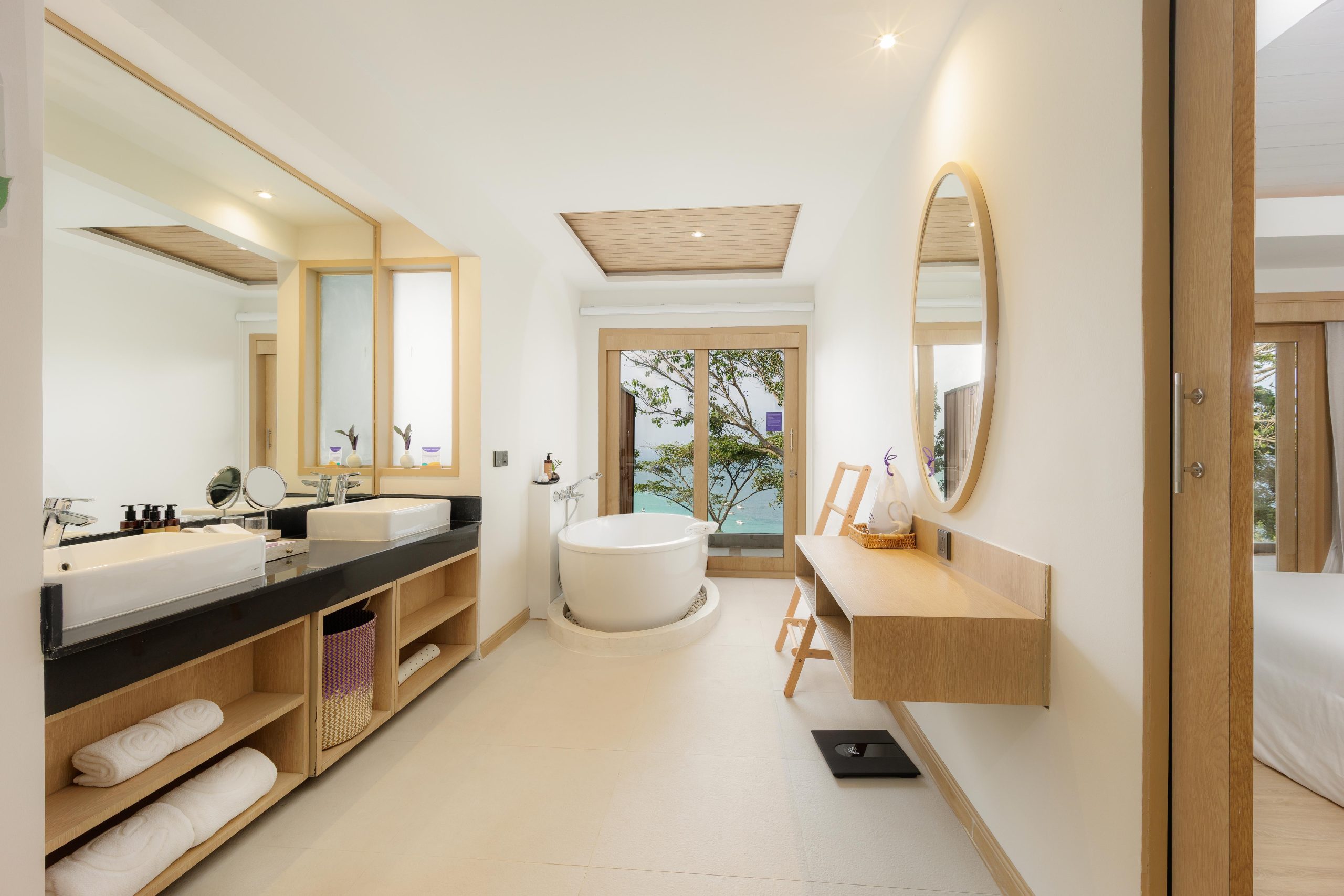 The resort’s concept centers on intimate villa living. With a limited collection of accommodations, each villa is thoughtfully arranged to ensure space, discretion, and immersion in nature. Interiors are composed in warm earth tones and natural textures, balancing traditional Thai accents with contemporary simplicity. Large windows and private terraces invite daylight and coastal breezes indoors, softening the boundaries between interior comfort and the surrounding tropical environment.