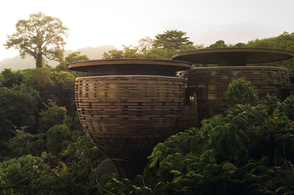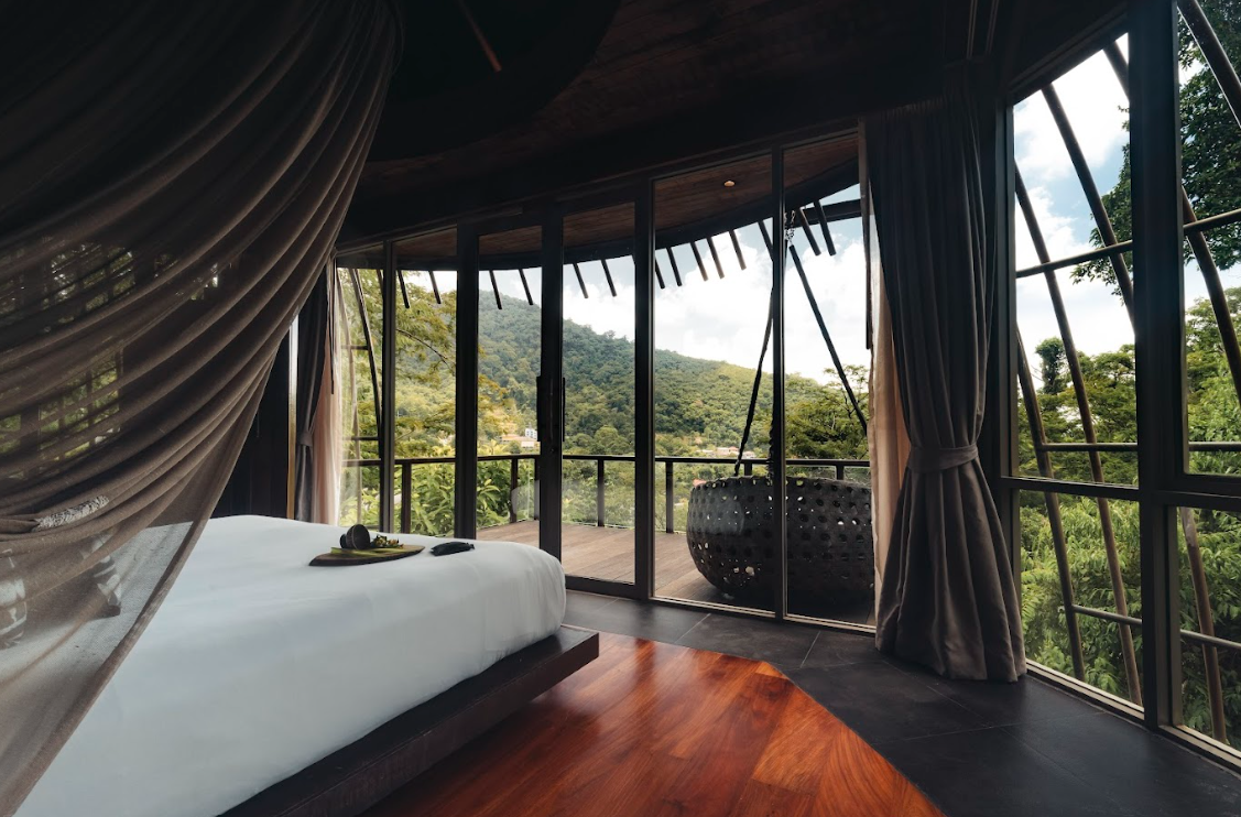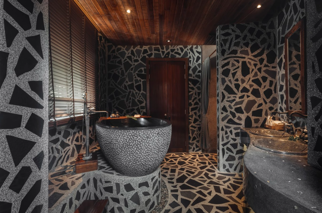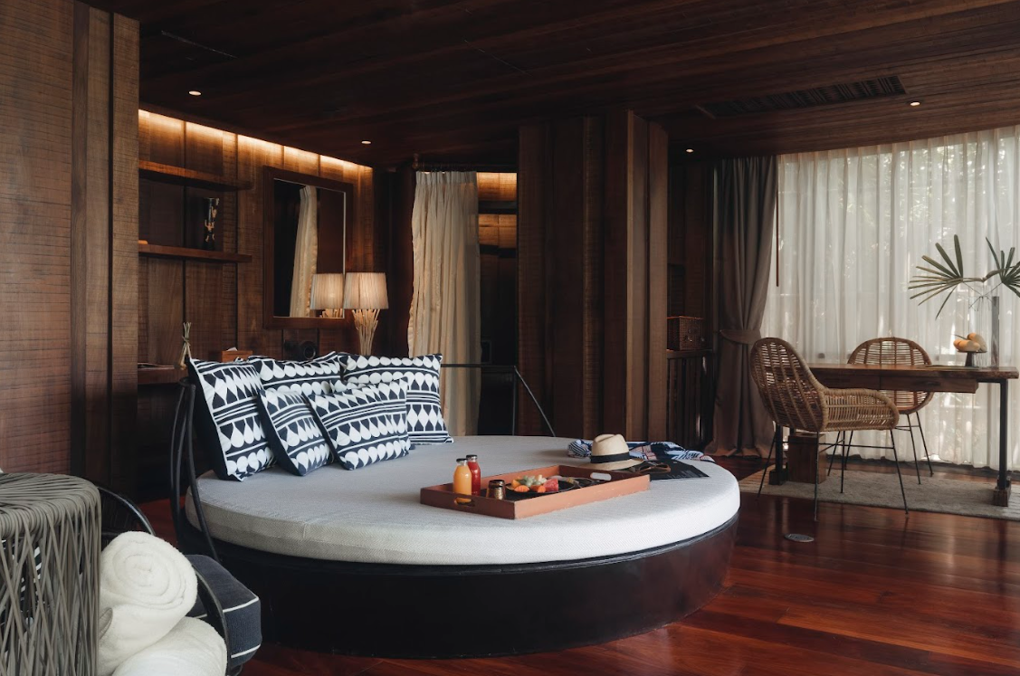 The interiors marry organic materials with modern comforts: hand-carved wooden details, soft silks, oversized soaking tubs, and expansive terraces. It’s luxury wrapped in nature — serene, sensual, and sustainable.