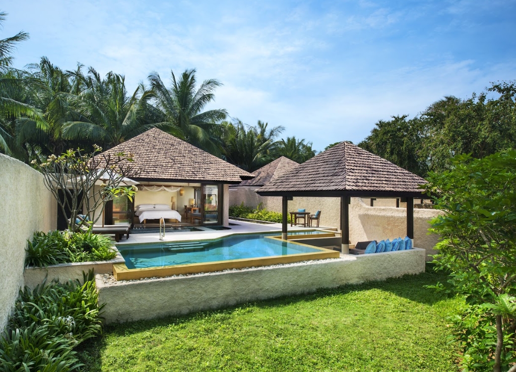 Each villa comes with a private swimming pool, sunken outdoor bathtub, and expansive floor-to-ceiling windows that frame breathtaking views of tropical gardens and the Gulf. Interiors feature soothing neutral tones, natural accents, and plush furnishings, offering a serene atmosphere for unwinding.